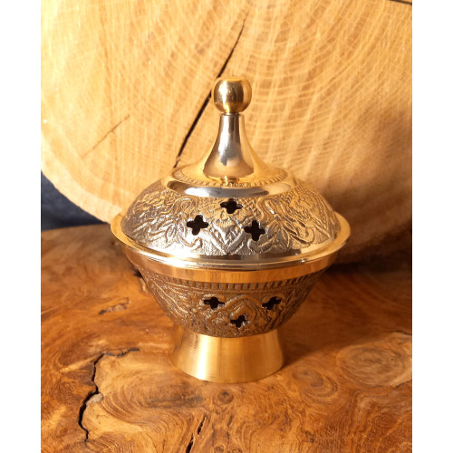 Räuchergefäß aus massivem Messing mit Gitter und Deckel.